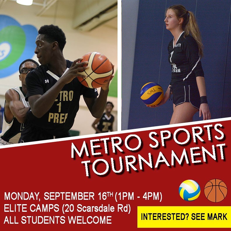 Metro Prep sports tournament takes place Monday September 16 from 1:00 to 4:00 pm at Elite Camps. This event is open to all students, please see Mark for more details.
